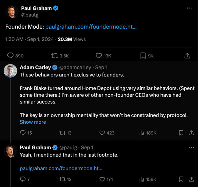 Paul Graham, a co-founder of the startup accelerator Y Combinator, recently published a blog post synthesizing insights from a talk that Brian Chesky, the co-founder and CEO of AirBnB, gave at a YC event during the last week of August. The post outlines the tension between the two modes of running a company: founder mode and manager mode. Think of manager mode as representing those well-known principles taught in business schools. Conversely, founder mode embodies those less understood, potentially more effective, principles that founders discover while running their companies.